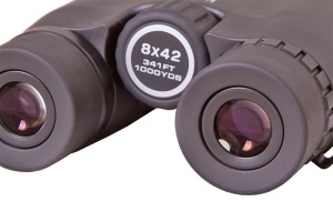 Поворотно-выдвижные наглазники позволяют с комфортом использовать этот бинокль тем, кто носит очки. Для компенсации незначительных дефектов зрения есть возможность небольшой регулировки диоптрий окуляров. Колесо фокусировки расположено в центре и имеет неровную поверхность для удобства регулировки в перчатках.