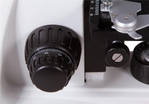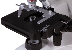 Микропрепараты устанавливаются на механическом предметном столике при помощи препаратоводителя. Столик можно перемещать по двум осям, доступны грубая и точная настройка резкости. Подсветка расположена под предметным столиком и состоит из яркого светодиода мощностью 5 Вт. Между подсветкой и образцом находится конденсор Аббе с ирисовой диафрагмой и держателем фильтра. Для питания подсветки требуется подключение к сети переменного тока. Яркость подсветки можно регулировать.